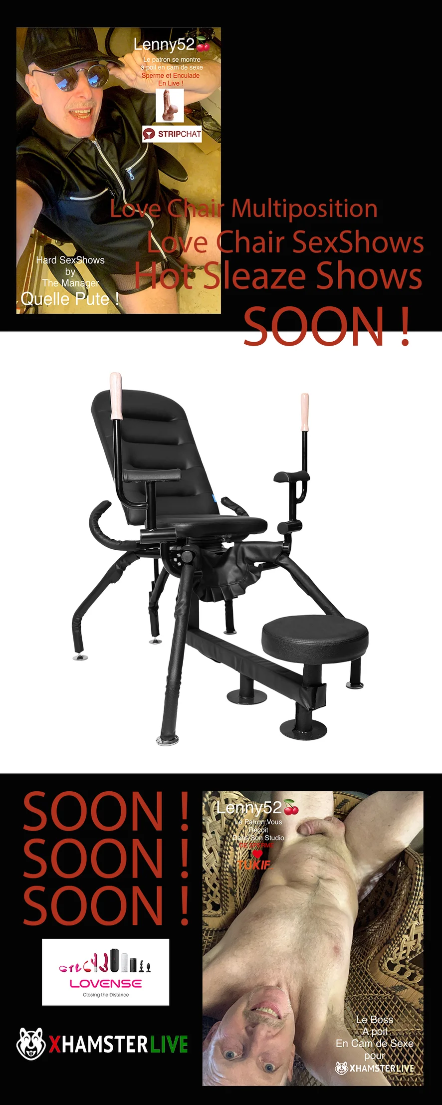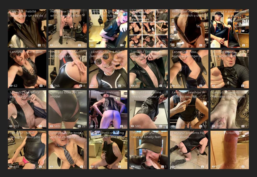 Live Shows… Lingerie… Sexy Acts for dirty minds… The boss does it for your pleasure… bravo Lenny52 ---- Lenny52, un monde de fantaisie, de débauche et de foutre ! Je suis Lenny52, je suis un pro-manager qui ose le foutre devant un public d'amateurs discrets... alors profitez-en... Tu veux voir mon bouton de rose épanoui, ouvert à la luxure ? Tu veux me voir béer de désir, miaulant sous l'assaut de ce qui s'enfonce allègrement dans ce cul ouvert à ta délectation ? Envie de me voir empalé sauvagement sur la bite de Jef Stryker ? Envie de jouir en regardant mon cul se faisant pénétrer par une multitude de godes vibrant bien fixés sur des machines à baise de multiple fabrication ? Vous voulez goûter à mon cul et à mon jus de couille ? Rejoignez-moi dans une session strictement intime... sur XhamsterLive & Stripchat !