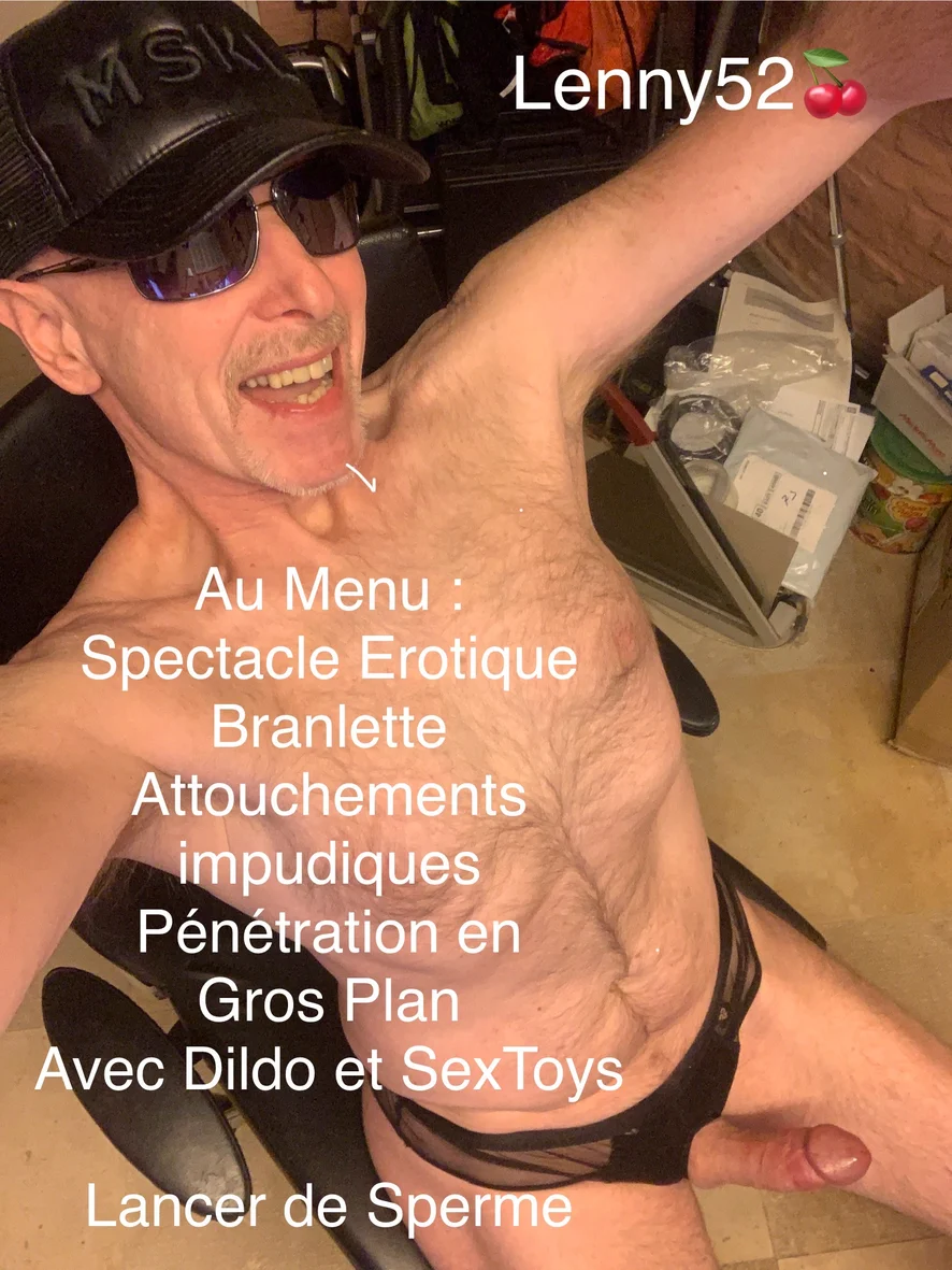 Exhibition et gestes impudiques… Mes Rendez-Vous de luxure…Live > je montre ma bite… > je montre mon cul… > j’astique mon dard turgescent… > je me prête à vos fantasmes > je me lubrifie le trou du cul en caméra rapprochée… > je me doigte l’orifice odorant ; orifice béant, en manque de defonce… > je m’habille classe pour mes shows … lingerie sexy et provoquante, licra, cuir, pvc, caoutchouc… les meilleures marques… Mr.B, Rob, Manstore, Eros Veneziani, ES, ASOX… > je fais mes shows libertins manipulant mon engin gonflé de sperme… le prépuce relevé, humectant la débauche… > la sauce monte et je souille la toile en Live, sans pudeur… > l’érotisme est au rendez-vous et mon cul défoncé par une machine à baise se tord de plaisir… > bienvenue… > je suis Lenny52🍒, de patron de club à pute de sexe… j’ai fait le pas… je suis à vous pour vous…